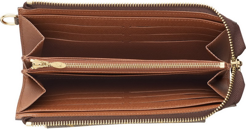 介绍:这款拉链式钱夹以经典的Monogram帆布治成,散发优雅气息。集多个实用的口袋和隔层于一身。附按钮开合和D型环。
