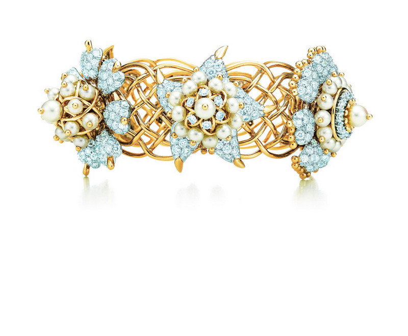 复杂精细的18K黄金丝穿行于每一朵独特的花朵间,给产品带来流动而具有凝聚力的野性感觉。采用Akoya海水珍珠。 |